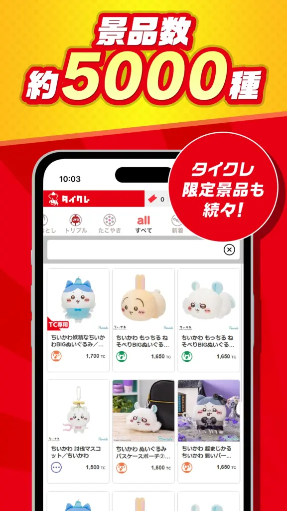 タイクレの最大の魅力の一つは、景品数の多さにあります。オンラインサービスであるため、店舗型のゲームセンターのように台数やサイズによる景品の限りがないため、約4,000種類以上の景品が揃っています。